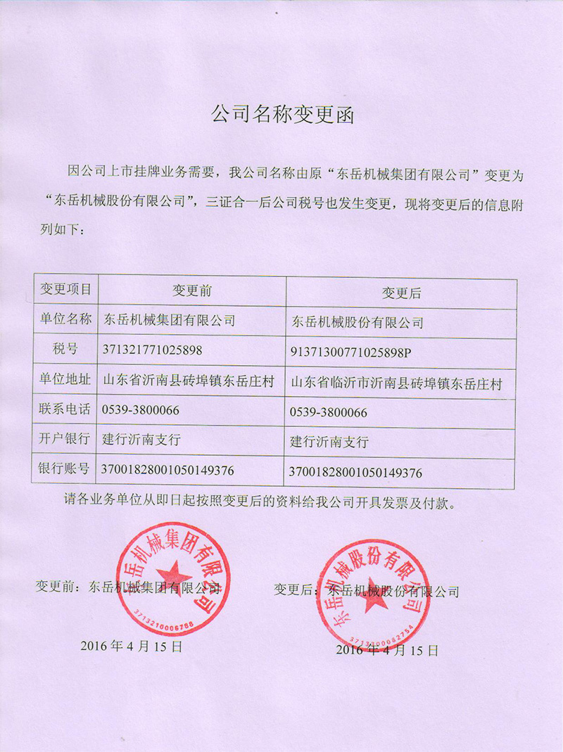 我公司更名為東岳機械股份有限公司